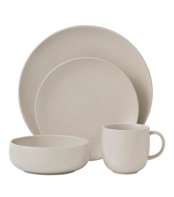 This Royal Doulton 'Mode Collection' place setting features clean lines and neutral colors creating understated style. This 4-piece place setting is crafted of earthy porcelain that adds simple elegance to any table. Brand: Royal Doulton Materials: Porcelain, stone Color: Mode putty Set includes: One(1) mug (3.5 inches high x 3.5 inches in diameter) One(1) bowl (2.2 inches high x 6 inches in diameter) One(1) small plate (1 inch high x 8.5 inches indiameter) One(1) large plate (1.2 inches high x 11 inches in diameter) Read more